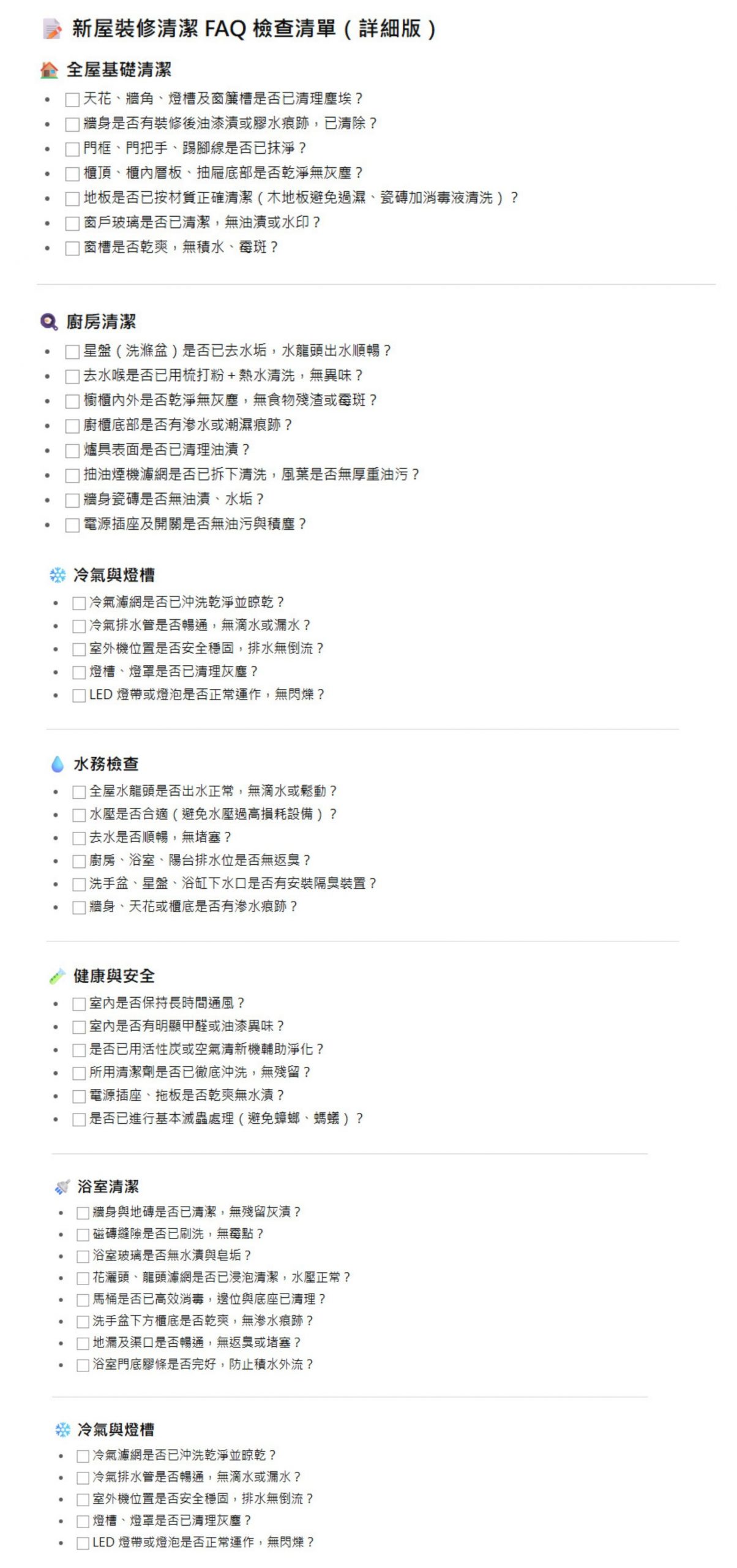 新屋裝修清潔 檢查清單